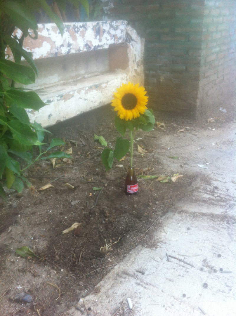 Audience of sunflowers (1:1) 2016 - sunflowers sourced locally, glass bottles of coca cola, bin bags waiting to be collected, phone, portable speakers, hose with water access.