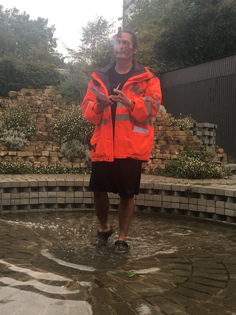 During performance I wore costume: A postman on his day off, 2018 - decommissioned postman jacket, painted garden butterflies, circle velcro, shorts, crocs, cigarette. Performed in the Orzco Garden water butt.