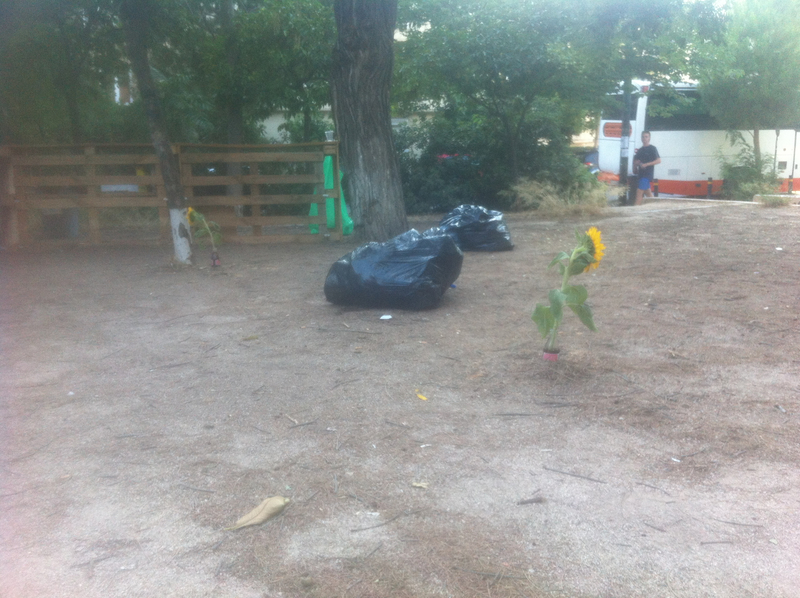 Audience of sunflowers (1:1) 2016 - sunflowers sourced locally, glass bottles of coca cola, bin bags waiting to be collected, phone, portable speakers, hose with water access.